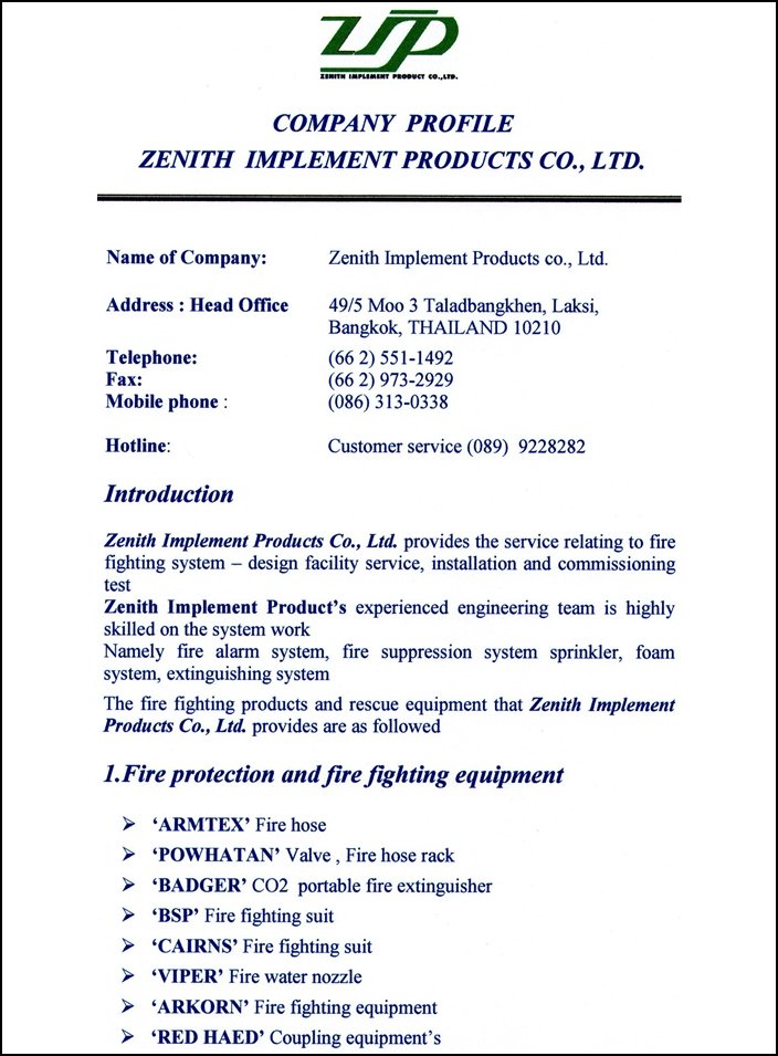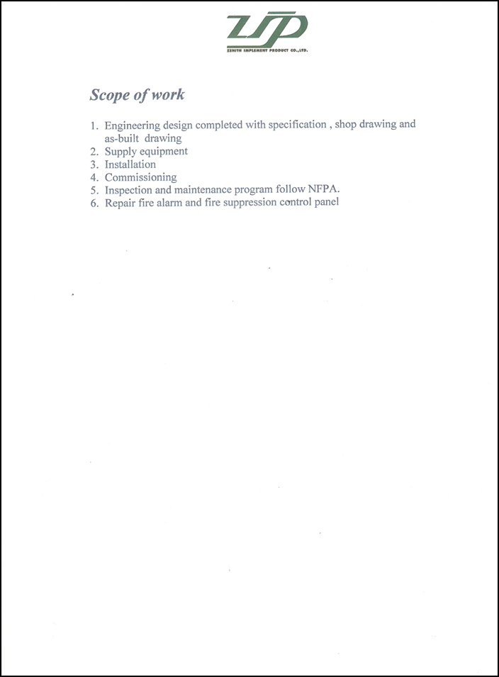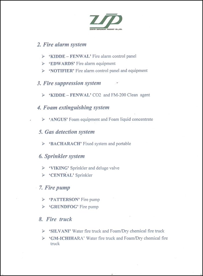 Zenith Implement Products Co., Ltd. provides the service relating to fire fighting system : Design facility service, installation, commissioning test and supply fire fighting & rescue equipment.